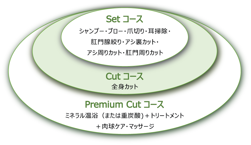 | Set コース | シャンプー・ブロー・爪切り・耳掃除・肛門腺絞り(肛門周りカット)・アシ裏カット・アシ先周りカット |